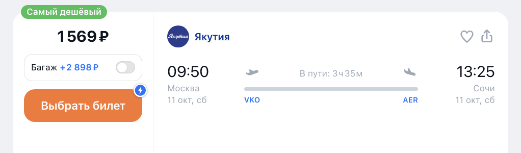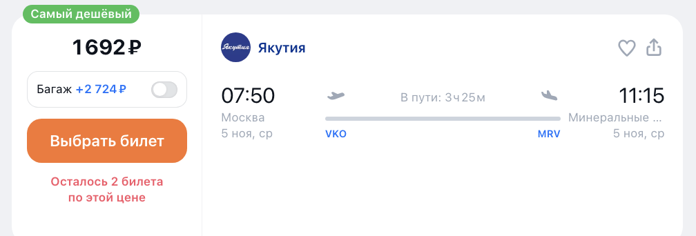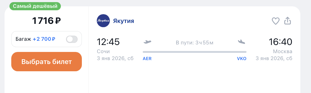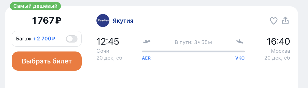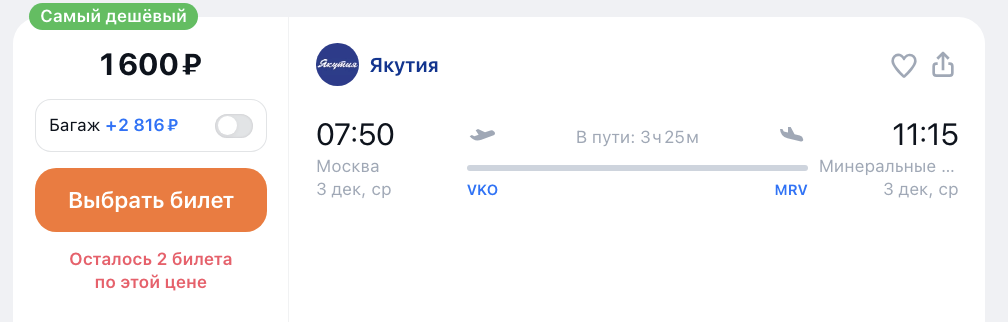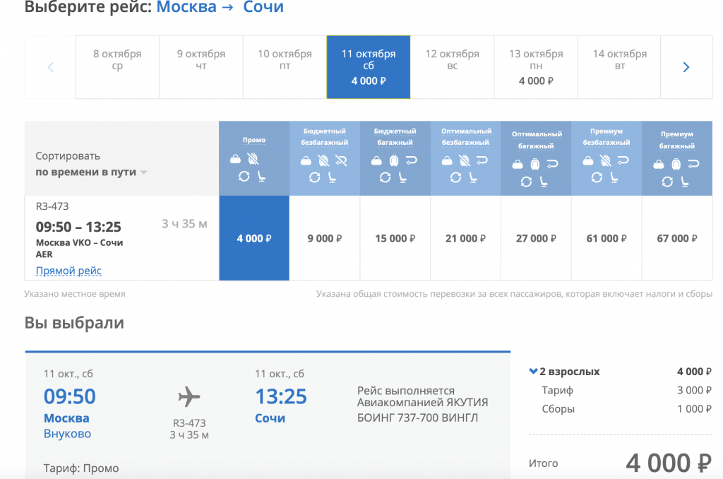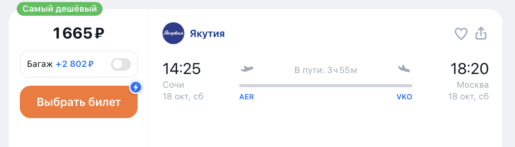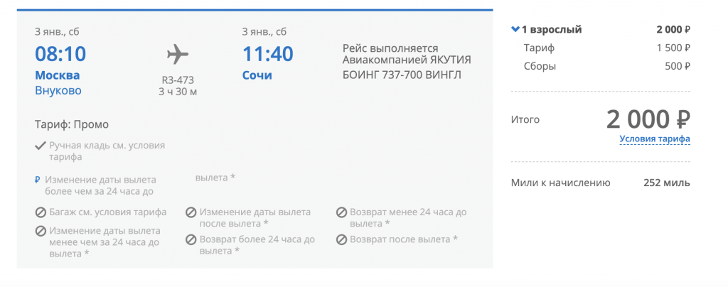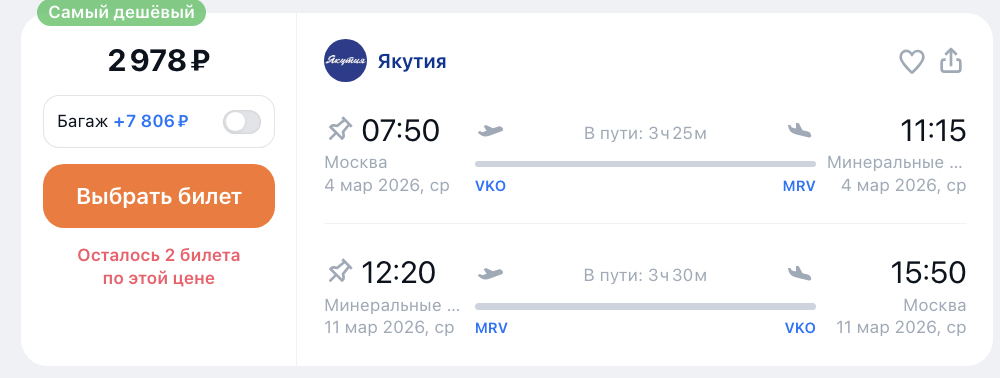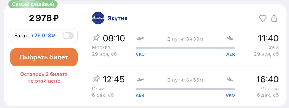 Неожиданно у Якутии появились билеты ИЗ Сочи и МинВоды (а не только В Сочи и МинВоды) — в итоге слетать из Москвы в Сочи можно в октябре-январе, а в МинВоды и в феврале-марте тоже. От 2980 рублей в обе стороны.