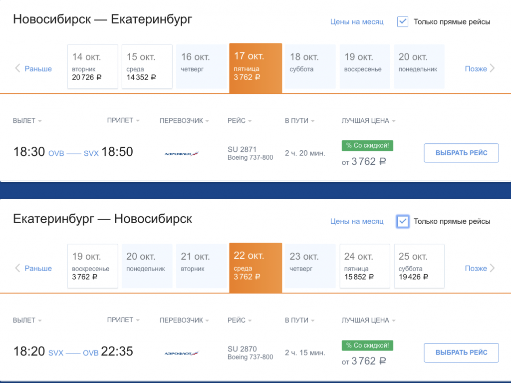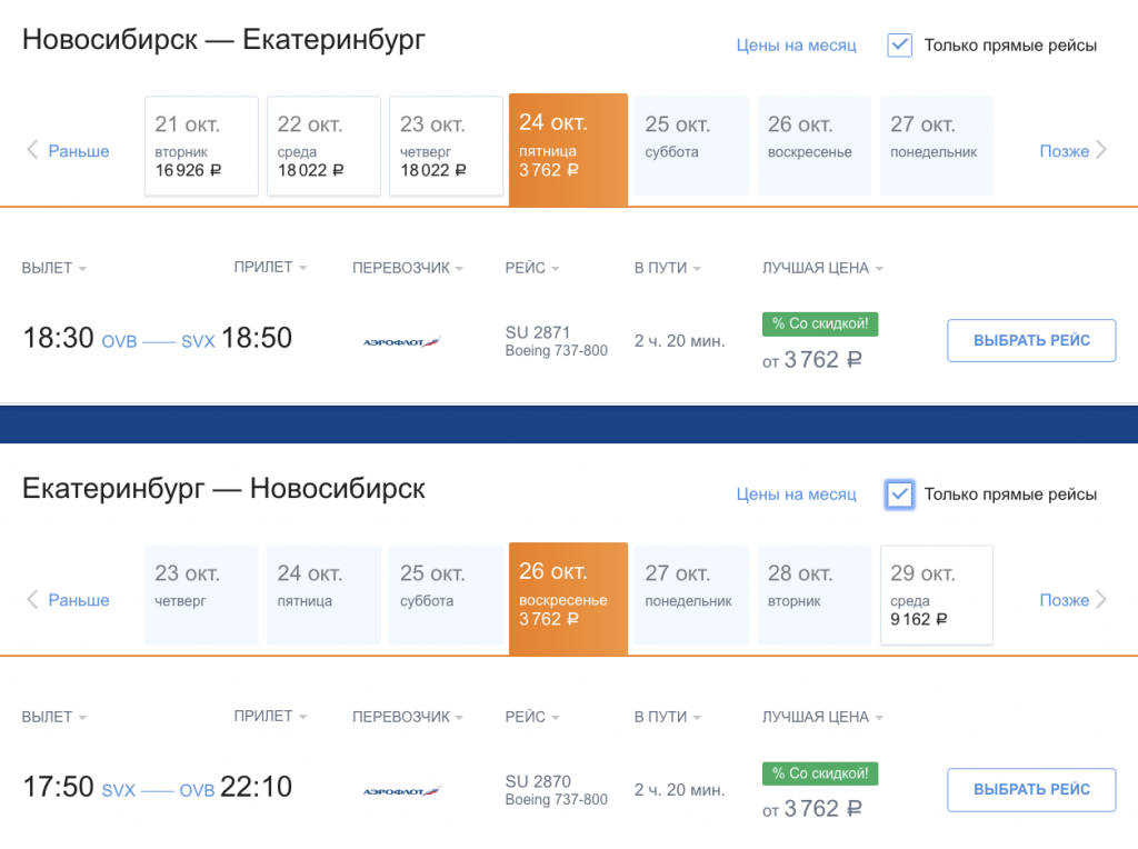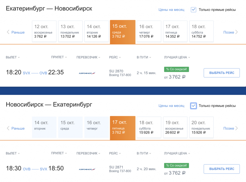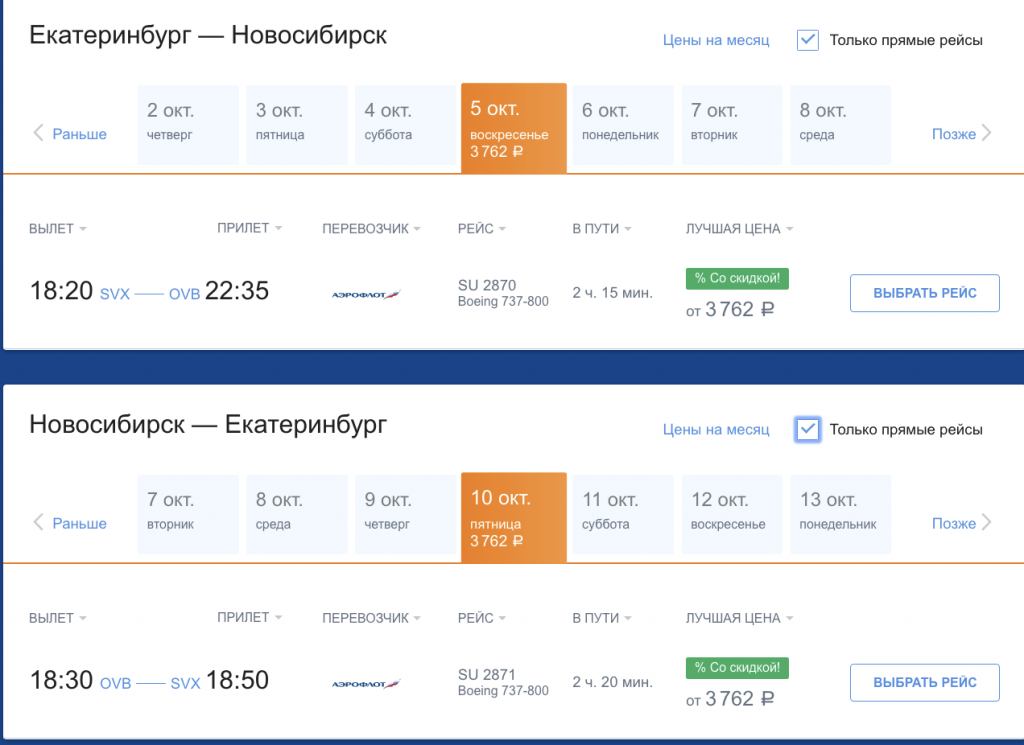 Хорошая цена от нацпера на октябрь: прямыми рейсами между Екатеринбургом и Новосибирском за 7500 в обе стороны (в одну — за 4200 рублей).
