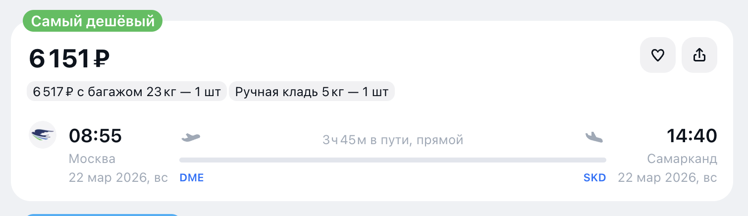 Авиакомпания Qanot Sharq готова отвезти вас в разные города Узбекистана по адекватной цене: прямые рейсы из Москвы в Ташкент, Самарканд, Фергану и Термез за 5980 рублей.