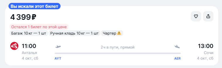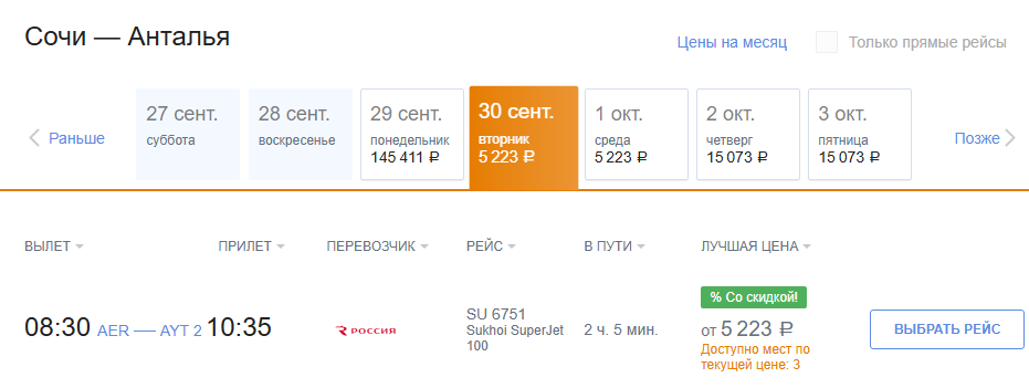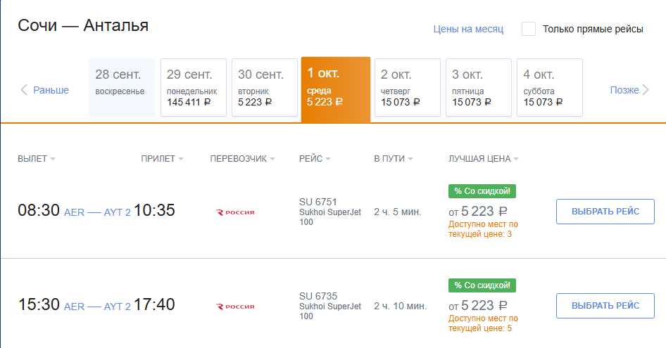 Вылеты из Сочи 30 сентября и 1 октября, обратно — 4 октября.