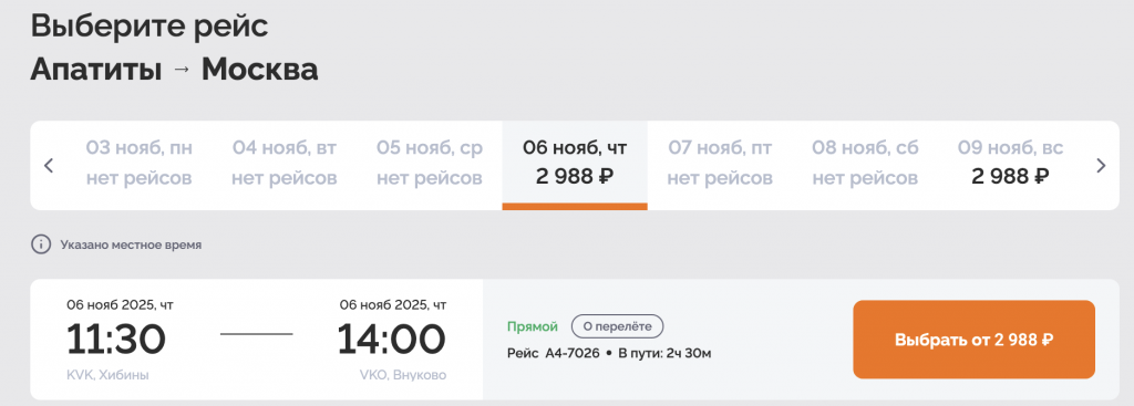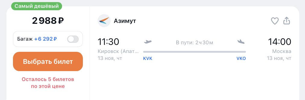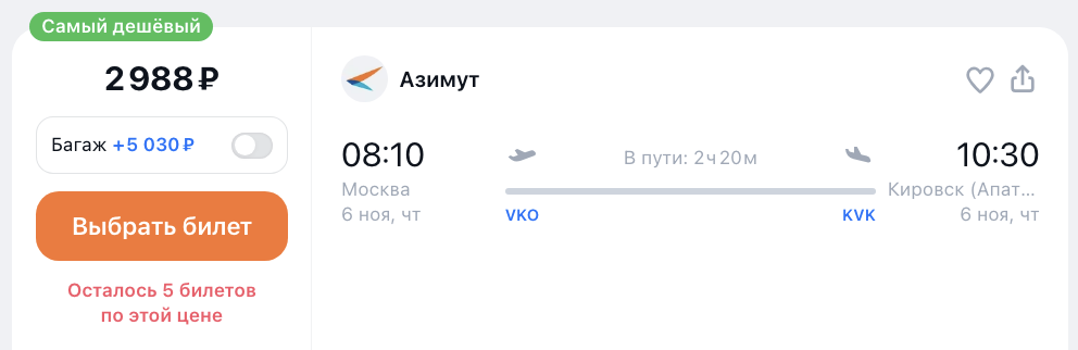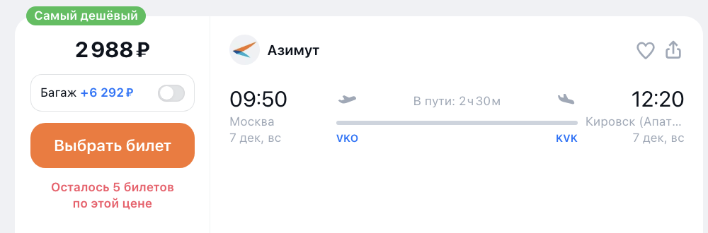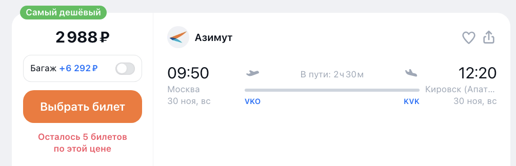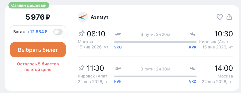 Гуд-прайс от Азимута на прямые рейсы между Москвой и Кировском (Хибины/Апатиты): 2998 рублей за билет — есть туда, и есть обратно на ноябрь-март.