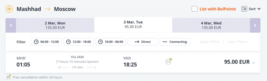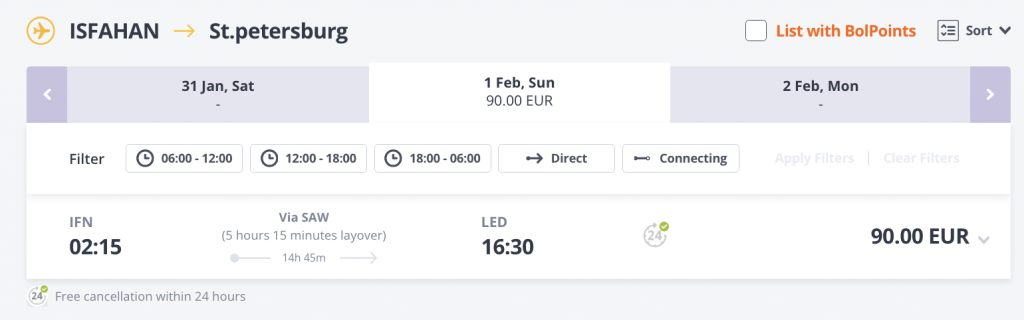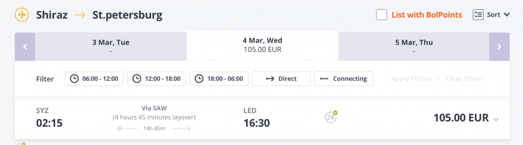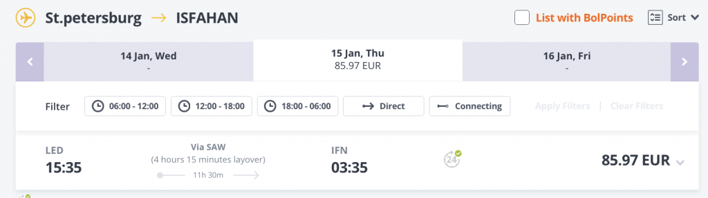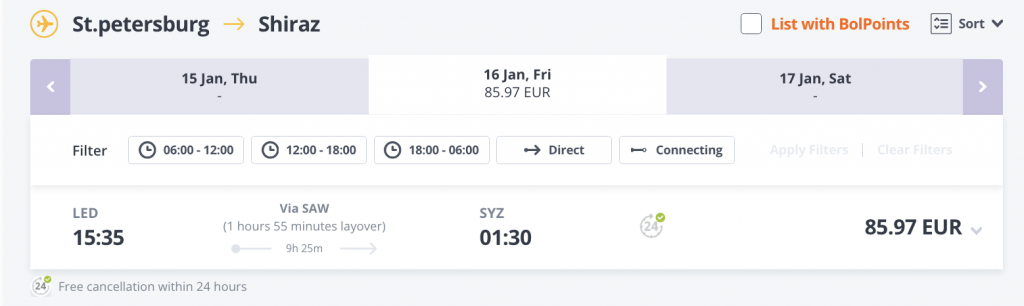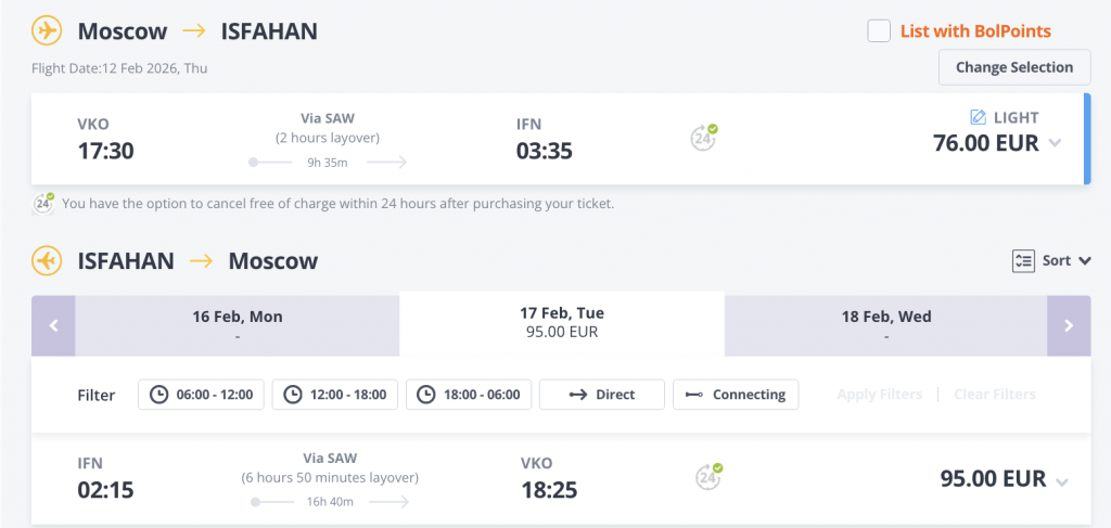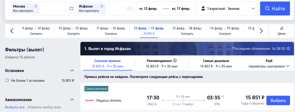 У Pegasus хорошие цены на билеты в Иран без всяких распродаж: из Москвы и Петербурга можно улететь в Исфахан и Шираз, а вернуться кроме этих двух городов, еще и из Мешхеда. Билеты можно взять и на трип.ком российской картой