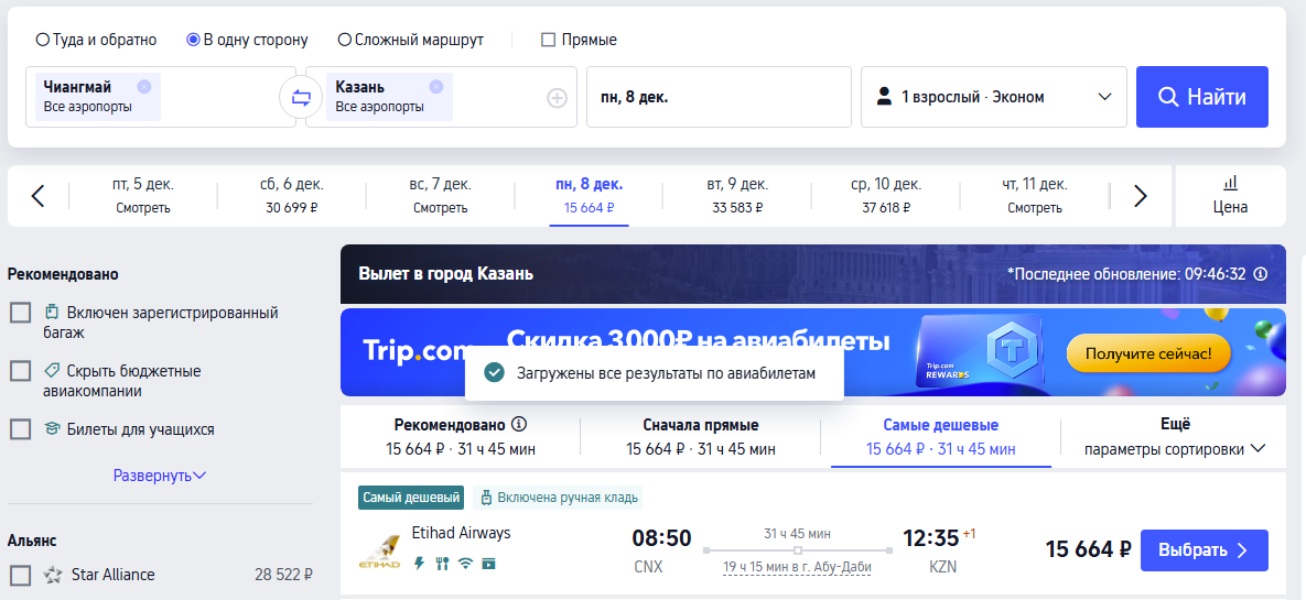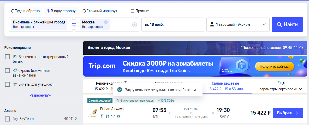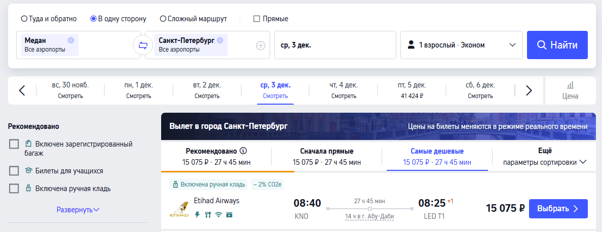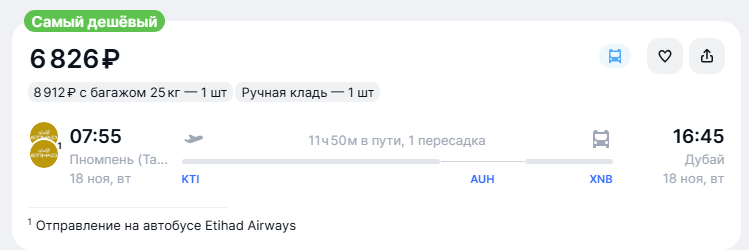 У достойной авиакомпании Etihad Airways снова нашлись дешевые возвраты из ЮВА: полеты из Таиланда, Индонезии и Камбоджи в Москву, Петербург, Казань и Сочи от 15100 рублей.