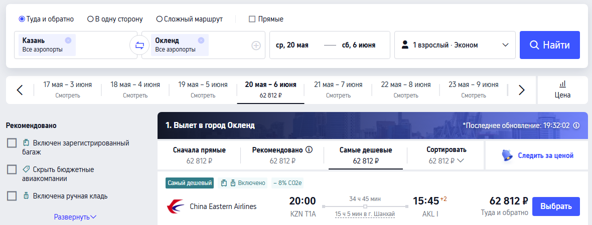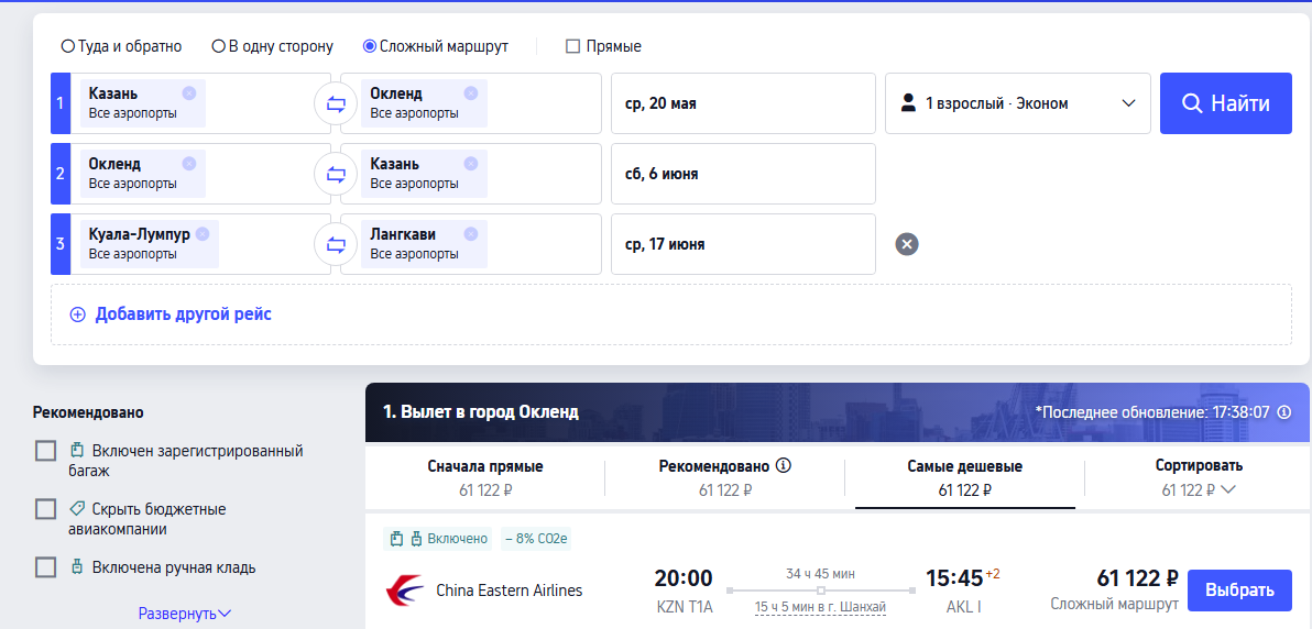 Казань — Окленд — Казань (без третьего сегмента не сильно дороже):